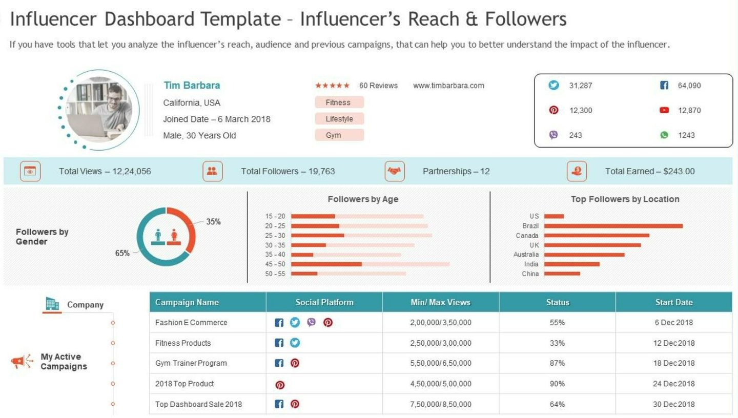 This dashboard showcases the core metrics that drive influencer success — Total Views, Total Followers, Partnerships, Total Earned, and Followers by Gender.
